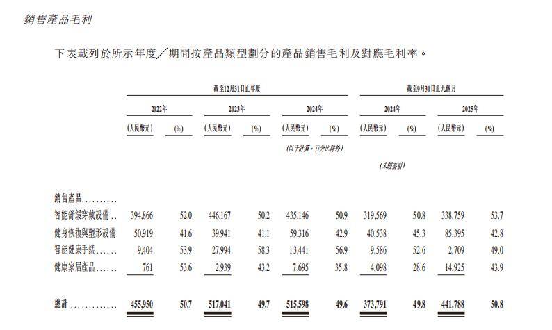 不同产品线的毛利率差异,进一步揭示SKG未来健康盈利质量依赖主业。据其招股书数据,按产品类型看,智能舒缓穿戴设备毛利率从2022年的52.0%微升至2025年前九个月的53.7%,期内曾探至50.2%;健身恢复与塑形设备从41.6%略升至42.8%,期内最低为41.1%;智能健康手表则从53.9%下滑至49.0%,期内最高曾达58.3%;健康家居产品从53.6%降至43.9%,期内曾触及28.6%的低点。