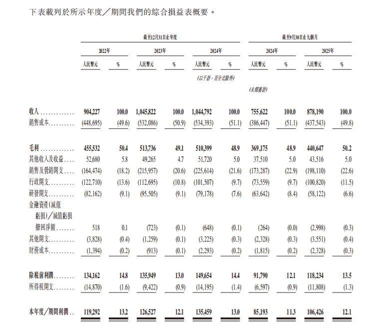 渠道选择最终仍会回到“毛利能否支撑高费用率”。招股书披露,其毛利率从2022年的50.4%,波动至2024年前九个月的48.9%,随后在2025年前九个月回升至50.2%。毛利率稳定提供了费用投入空间,但毛利率提升并非永久“护城河”,它更多来自产品组合与定价策略,一旦竞争者通过更低价格或更高强度投放抢占流量,毛利与费用的平衡关系会面临挑战。