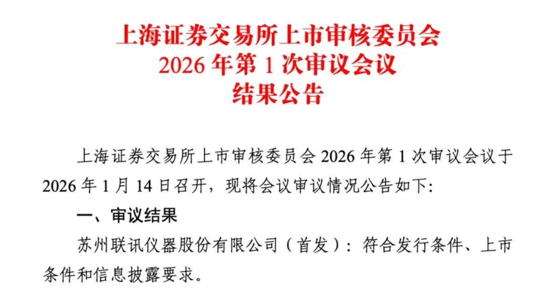 1月14日,上交所上市审核委员会召开2026年第1次上市审核委员会审议会议,审议苏州联讯仪器股份有限公司(以下简称“联讯仪器”)首发事项,最终公司顺利过会。业界指出,这是上交所2026年首单IPO过会。