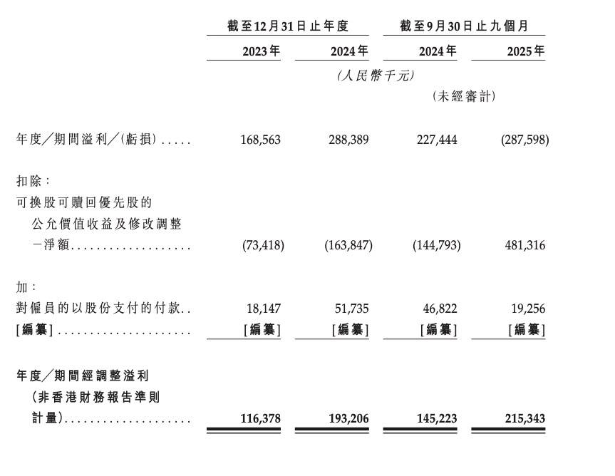 但若扣除可换股可赎回优先股的公允价值变动等非经营性影响,其年度╱期间经调整溢利 (非香港财务报告准则计量 )则分别为1.16亿元、1.93亿元和2.15亿元,2024年和2025年前三季同比增速依然高达66.38%和48.28%。