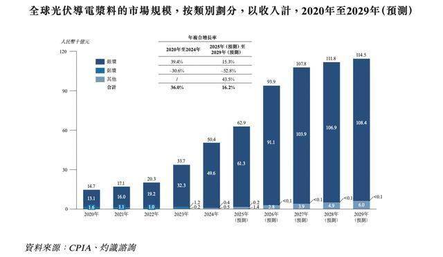 而全球光伏导电浆料市场随着光伏产业的兴起发展迅速,由2020年的147亿元增长至2024年的504亿元。未来随着光伏电池片单位银耗量的下降及贱金属材料的推广,市场增速有所放缓但依旧增长稳健,预计在2029增长至1,145亿元,2025年至2029年期间年复合增长率预计为16.2%。