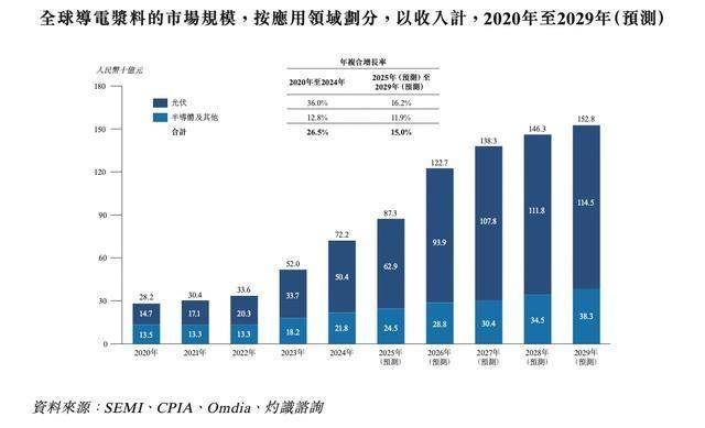 全球导电浆料市场受光伏发展推动下在过去几年发展迅速,由2020年的282亿元增长为2024年的722亿元。其中光伏是导电浆料的最大应用板块,2024年占比达 69.8%。随着光伏、半导体等产业进一步扩容,全球导电浆料市场预计将进一步增长至2029年的1,528亿元,2025至2029年间年复合增长率达15.0%。