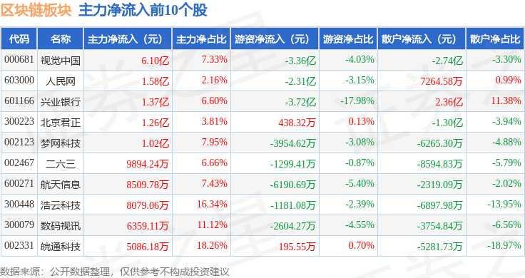 从资金流向上来看,当日区块链板块主力资金净流出225.75亿元,游资资金净流入29.18亿元,散户资金净流入196.57亿元。区块链板块个股资金流向见下表: