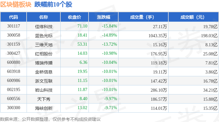 证券之星消息,1月15日区块链板块较上一交易日下跌1.75%,佳缘科技领跌。当日上证指数报收于4112.6,下跌0.33%。深证成指报收于14306.73,上涨0.41%。区块链板块个股涨跌见下表: