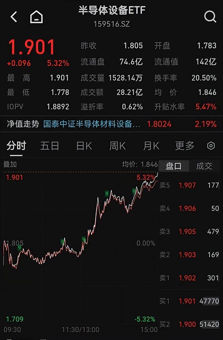 沪深两市成交额2.91万亿元,较上一个交易日缩量1.04万亿元。截至收盘,沪指跌0.33%,深成指涨0.41%,创业板指涨0.56%。半导体设备ETF(159516)午后放量上涨,收涨5.32%。
