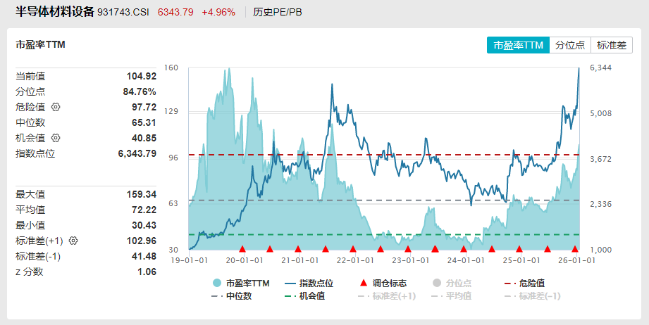 半导体设备具备催化明确优点,建议持续关注半导体设备ETF(159516)。目前,存储涨价持续超出预期、两存上市等事件直接拉动半导体设备预期,同时,目前国产半导体设备开始与海外算力共振,美光、闪迪、拉姆研究、应用材料等大厂的动态都有望成为催化。截至2026年1月15日,半导体设备ETF标的指数PETTM为104.92x,位于上市以来84.78%分位。虽然近期涨幅较大,但是历史分位仍然低于半导体设计等环节,仍具有很强的布局性价比,建议持续关注。