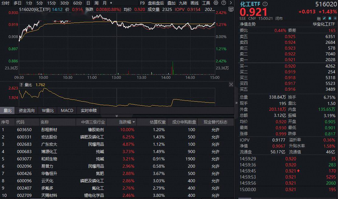 成份股方面,橡胶助剂、磷化工、纯碱等板块部分个股涨幅居前。截至收盘,彤程新材涨停,宏达股份飙涨6.25%,广东宏大大涨4.87%,博源化工、和邦生物双双涨超3%。