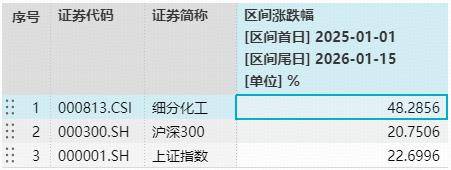 注:统计区间为2025年1月1日至2026年1月15日,细分化工指数近5个完整年度的涨跌幅为:2021年,15.72%;2022年,-26.87%;2023年,-23.17%;2024年,-3.83%;2025年,41.09%。指数成份股构成根据该指数编制规则适时调整,其回测历史业绩不预示指数未来表现。