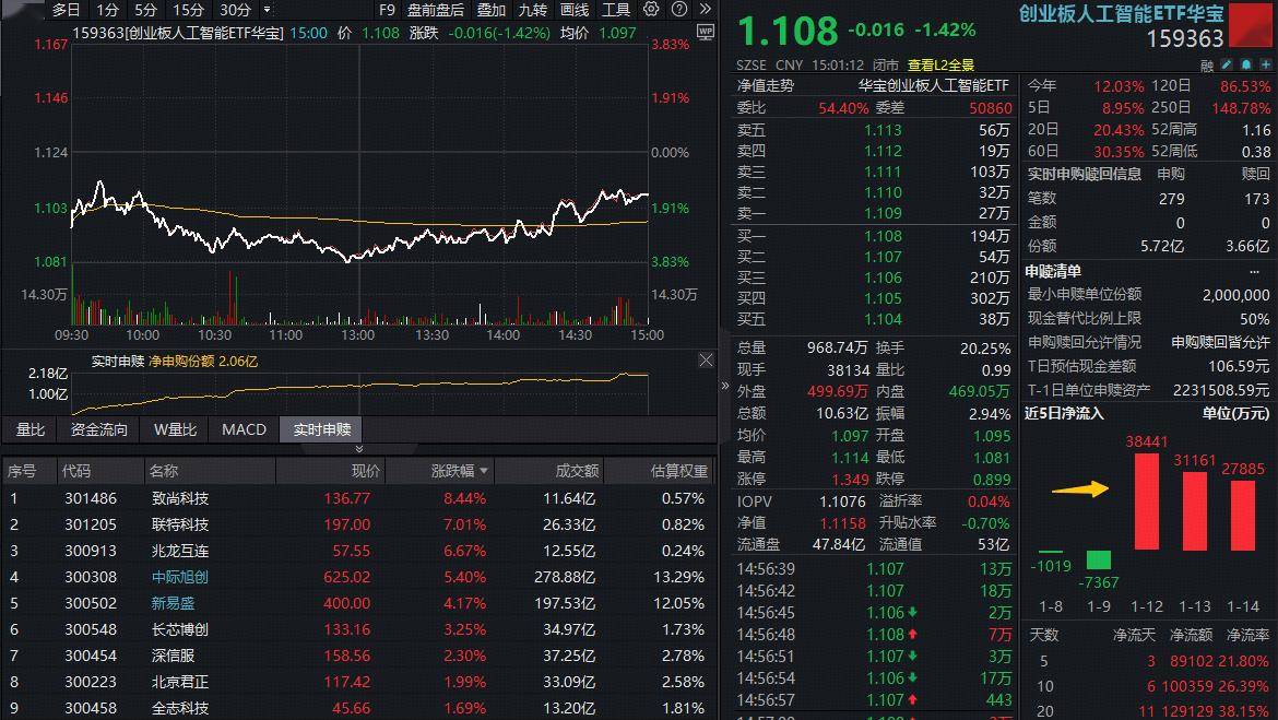 热门ETF方面,双线布局“算力+AI应用”的创业板人工智能ETF(159363)早盘一度下探逾3%,尾盘跌幅收窄,日线顽强收阳!单日成交超10亿元,资金持续加码,全天净申购2.06亿份,此前三日已累计增持9.7亿元。