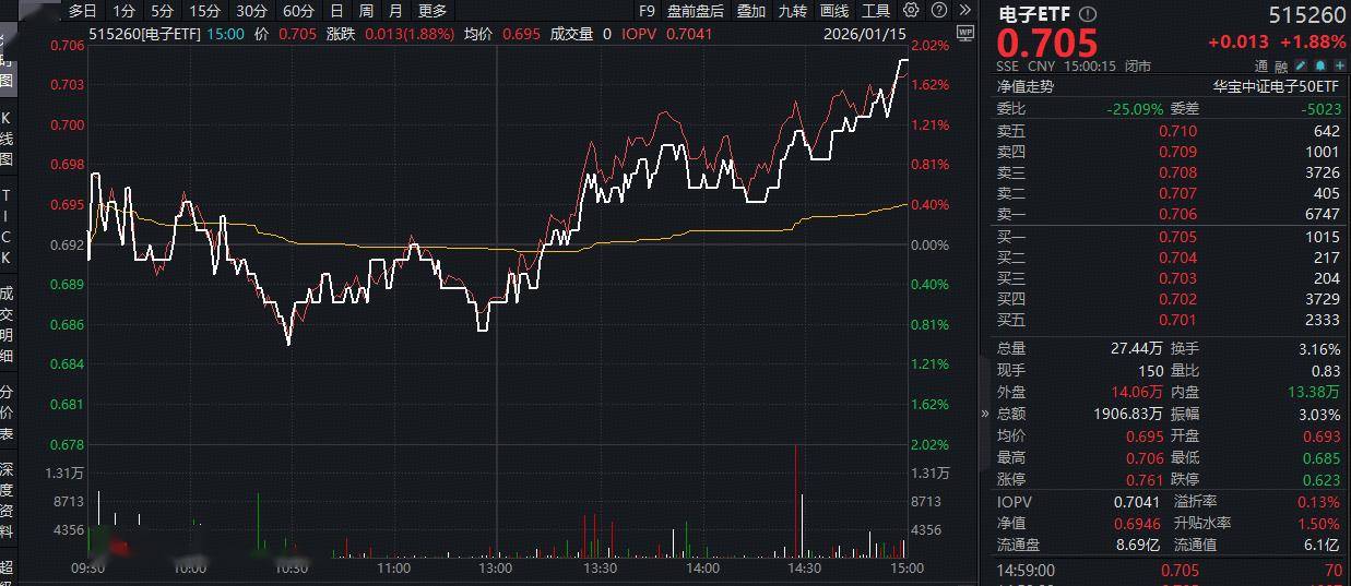 热门ETF方面,荟聚电子板块核心龙头的电子ETF(515260)场内价格劲涨1.88%,一举收复5日均线。