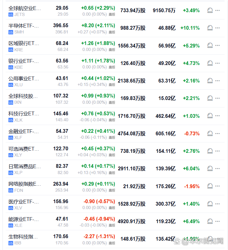 【航空业ETF收涨约2.3%,和半导体ETF领跑美股行业ETF,标普能源板块跌0.9%】周四(1月15日),全球航空业ETF收涨2.29%,半导体ETF涨2.11%,区域银行ETF涨1.88%,银行业ETF涨1.78%,全球科技股指数ETF、科技行业ETF、可选消费ETF、网络股指数ETF至多涨0.93%,能源业ETF跌0.94%,生物科技指数ETF跌1.31%。
