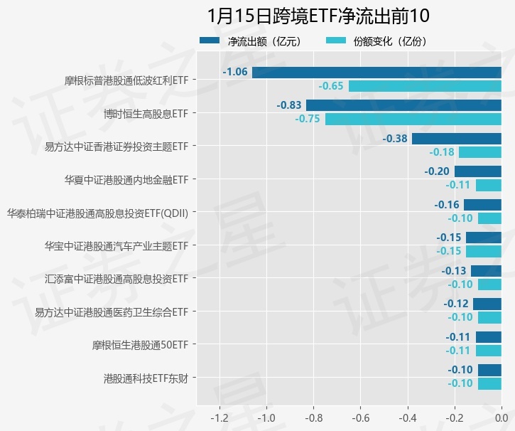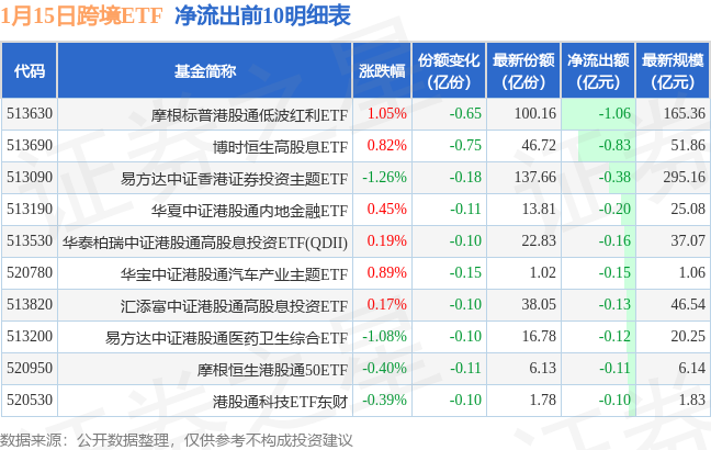 当日有31只跨境ETF基金出现资金净流出,其中净流出排首位的是摩根标普港股通低波红利ETF(513630),份额减少了6500.0万份,净流出额为1.06亿元。
