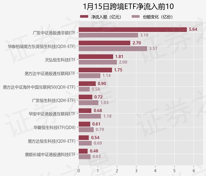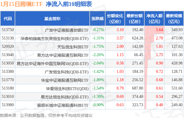 当日有35只跨境ETF基金出现资金净流入,其中净流入排首位的是广发中证港股通非银ETF(513750),份额增加了3.1亿份,净流入额为5.64亿元。