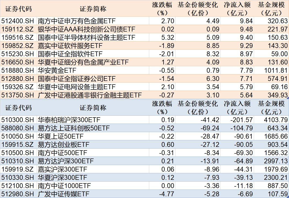 ETF规模速报 | 有色金属ETF净流入超9亿元,沪深300ETF华泰柏瑞净流出超201亿元