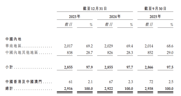 不过华南地区的门店总量近年增长缓慢,2024年较上年同期小幅增长了12家,2025年1至9月净减少了15家,同期公司来自华南地区的收入也同比下降约6.83%至55.08亿元。