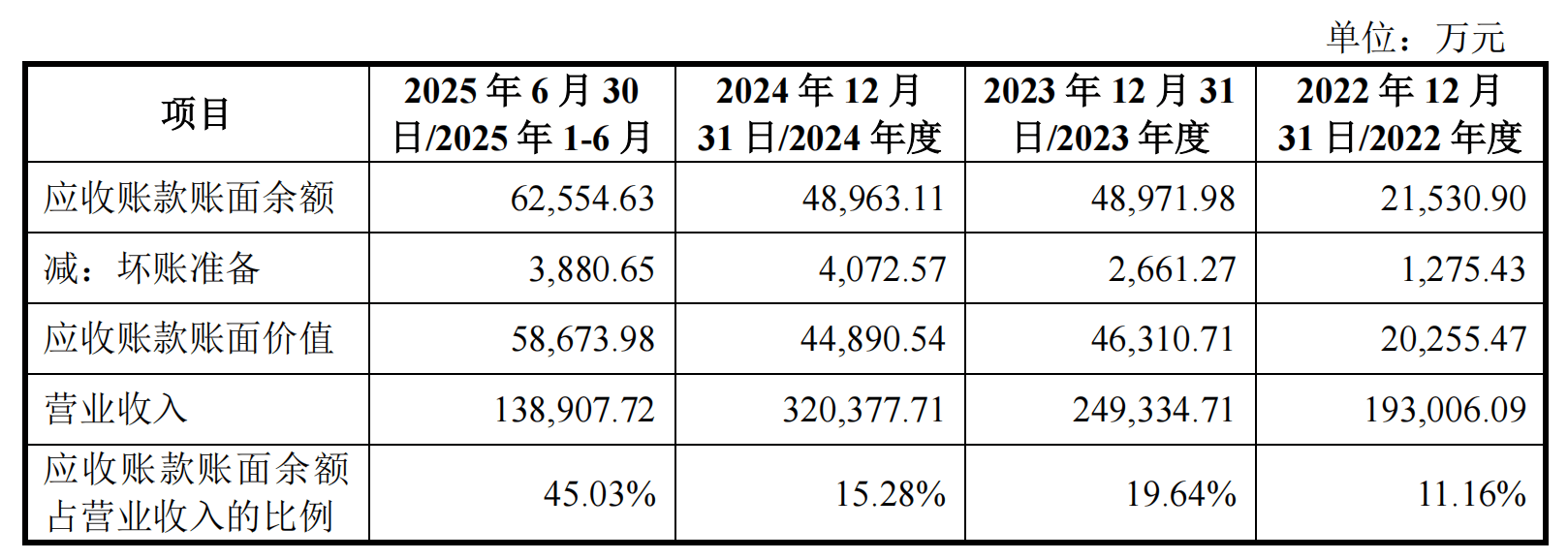 报告期各期末,惠康科技应收账款账面余额分别为2.15亿元、4.9亿元、4.9亿元、6.26亿元,占营业收入的比例分别为11.16%、19.64%、15.28%、45.03%。