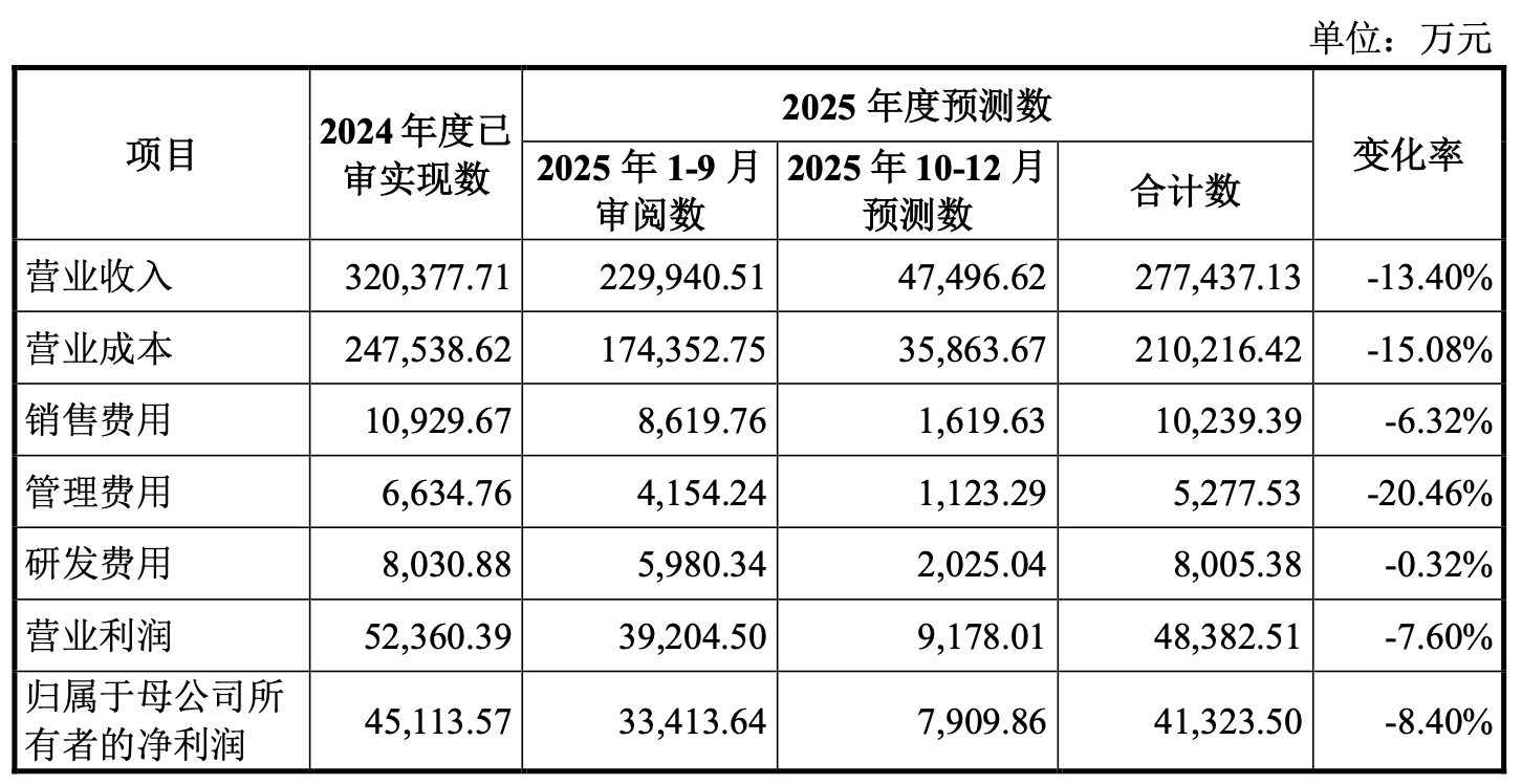 2025年度,公司预测实现营业收入27.74亿元,较2024年度下降13.40%,预计下降幅度较2025年1-9月进一步收窄2.49个百分点,主要随着11月份美国关税的下降,公司预计美国市场的销售订单持续恢复;