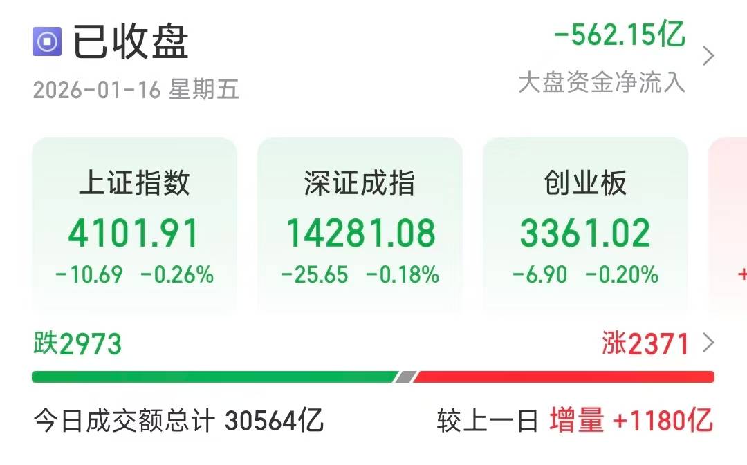 【大河财立方消息】1月16日,午后A股再度冲高回落,三大股指集体收跌。上证指数险守4100点,收跌0.26%;深证成指报14281.08点,跌0.18%;创指报3361.02点,跌0.20%。市场成交额3.06万亿元,个股跌多涨少,下跌个股超2973只。