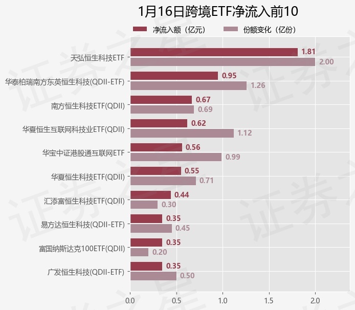当日有34只跨境ETF基金出现资金净流入,其中净流入排首位的是天弘恒生科技ETF(520920),份额增加了2.0亿份,净流入额为1.81亿元。