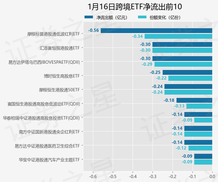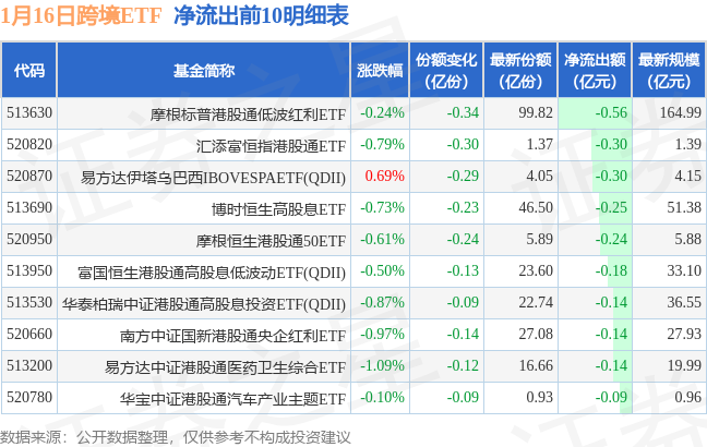 当日有28只跨境ETF基金出现资金净流出,其中净流出排首位的是摩根标普港股通低波红利ETF(513630),份额减少了3400.0万份,净流出额为5572.41万元。
