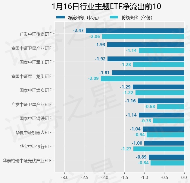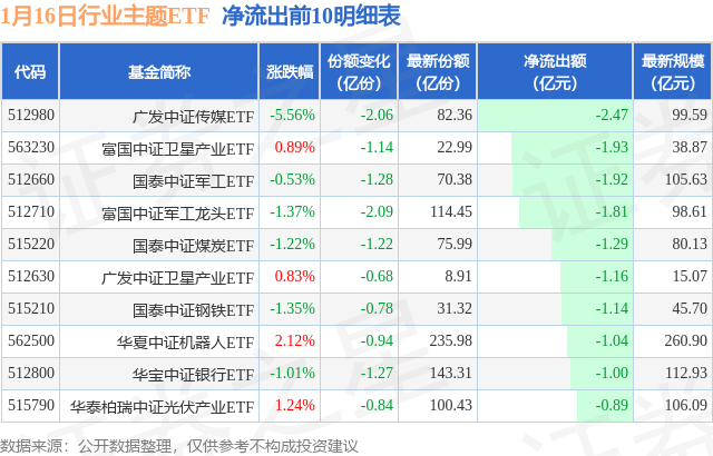 当日有109只行业主题ETF基金出现资金净流出,其中净流出排首位的是广发中证传媒ETF(512980),份额减少了2.06亿份,净流出额为2.47亿元。