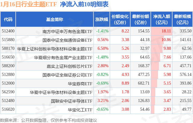 当日有135只行业主题ETF基金出现资金净流入,其中净流入排首位的是南方中证申万有色金属ETF(512400),份额增加了8.22亿份,净流入额为18.11亿元。