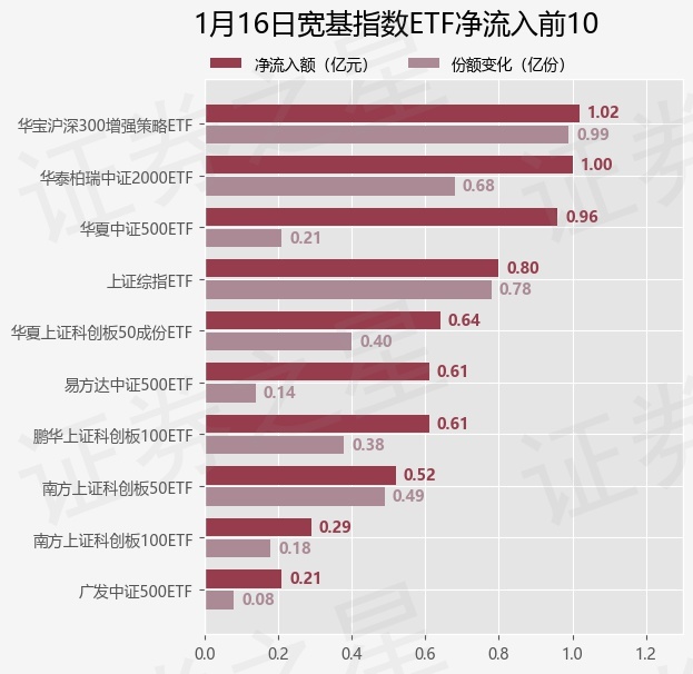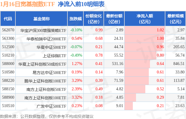 当日有32只宽基指数ETF基金出现资金净流入,其中净流入排首位的是华宝沪深300增强策略ETF(562070),份额增加了9900.0万份,净流入额为1.02亿元。