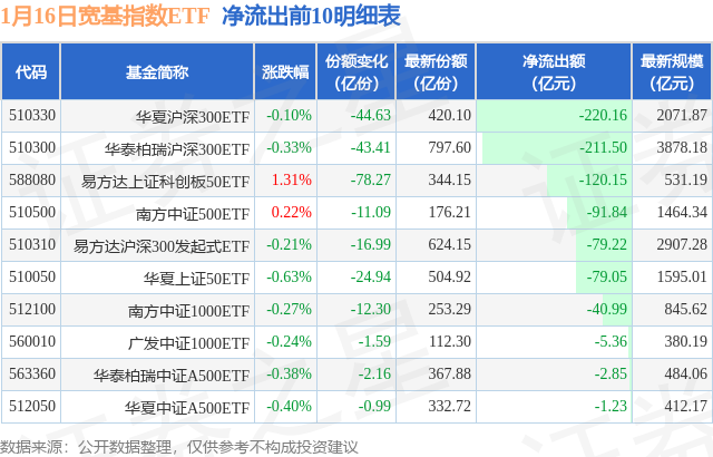 当日有78只宽基指数ETF基金出现资金净流出,其中净流出排首位的是华夏沪深300ETF(510330),份额减少了44.63亿份,净流出额为220.16亿元。