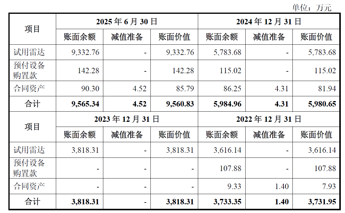招股书显示,报告期内公司其他非流动资产持续上升,截至2025年上半年,其他非流动资产中试用雷达账面余额达9332.76万元。
