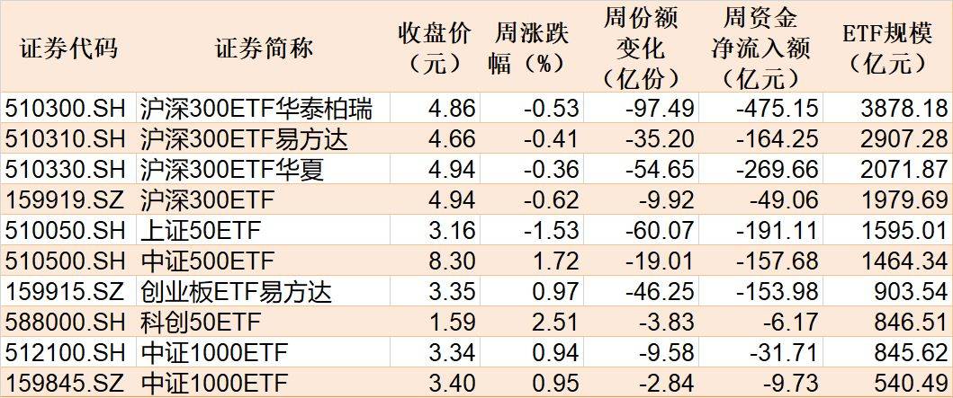 具体ETF方面,规模较大的10只宽基指数ETF本周合计净流出1508.5亿元,其中沪深300ETF华泰柏瑞净流出475.15亿元。