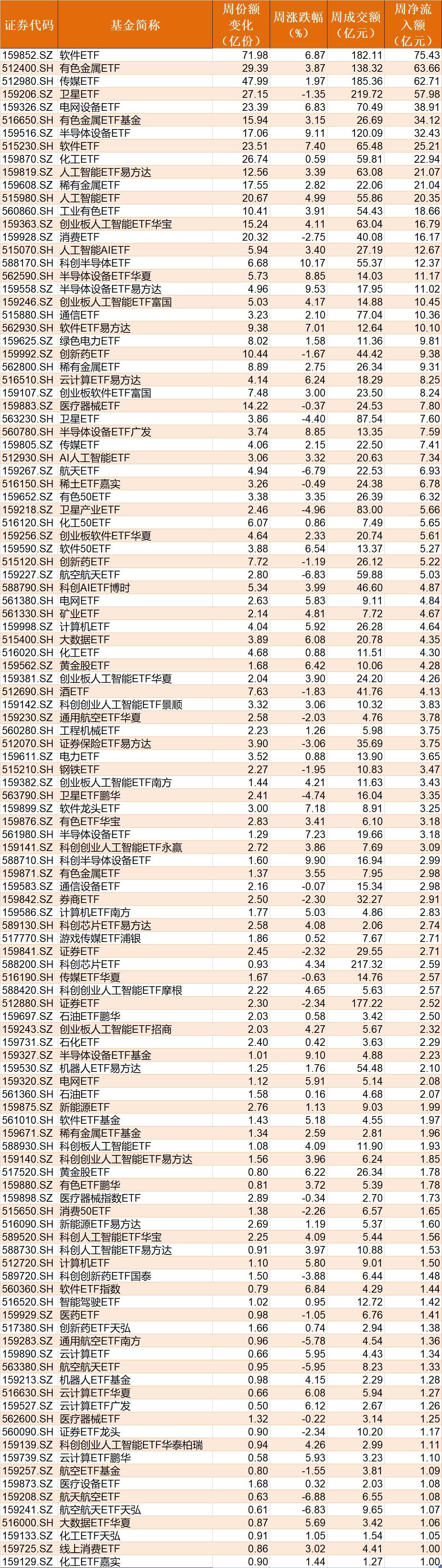 在行业主题ETF方面,本周净流入资金超1亿元的基金有117只,其中软件ETF、有色金属ETF和传媒ETF的份额分别增加了65.58亿份、29.39亿份和47.99亿份,净流入资金68.82亿元、63.66亿元和62.71亿元。