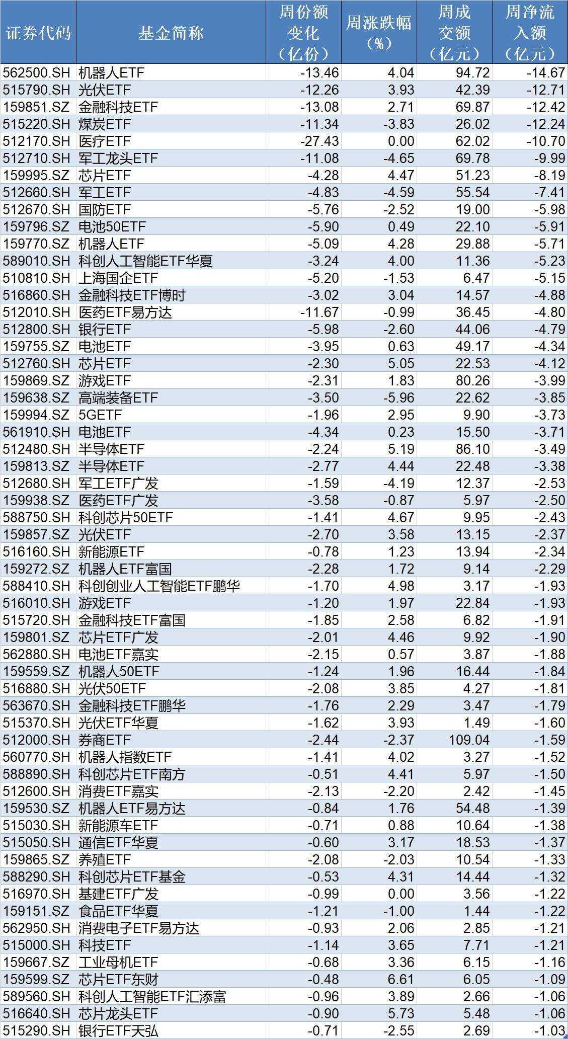 在资金流出方面,本周有56只行业主题ETF净流出逾1亿元,其中机器人ETF、光伏ETF和金融科技ETF的份额分别减少13.46亿份、12.26亿份和13.08亿份,分别净流出资金14.67亿元、12.71亿元和12.42亿元。