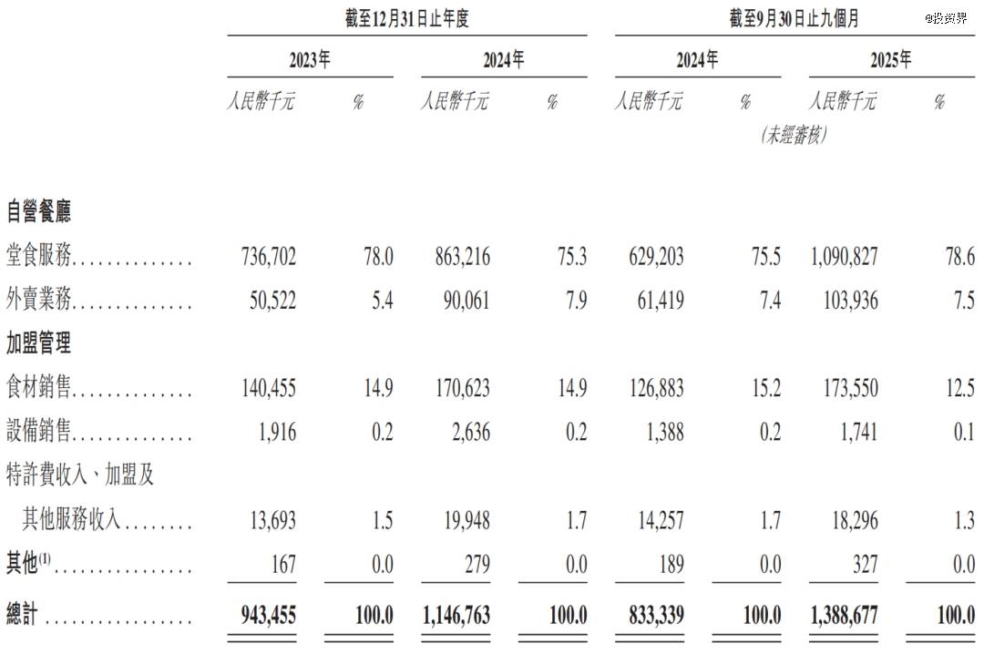 收入结构上,自营餐厅构成了主要业务支柱,占比近85%,其中堂食又为核心收入来源,2023年、2024年占比分别为78%、75.3%。公司的加盟收入主要包括食材、设备销售及特许费等。