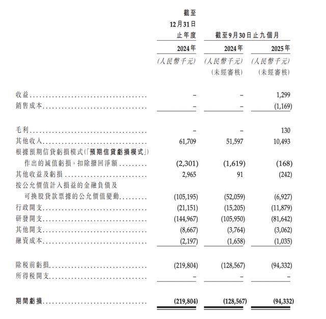 嘉因生物目前并无获准作商业销售的产品,且于往绩记录期间录得亏损。2024年、2025年前9月,公司收益分别为0元、129.9万元,期间亏损分别为2.2亿元、9433.2万元。