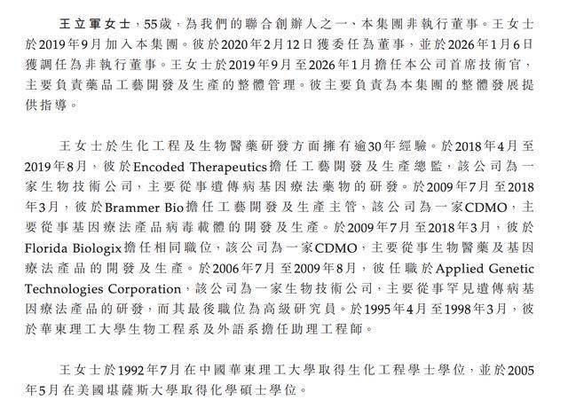 王立军于生化工程及生物医药研发方面拥有逾30年经验。于2018年4月至2019年8月,她于Encoded Therapeutics担任工艺开发及生产总监。于2009年7月至2018年3月,她于Brammer Bio担任工艺开发及生产主管。于2009年7月至2018年3月,她于Florida Biologix担任相同职位。于2006年7月至2009年8月,她任职于Applied Genetic Technologies Corporation,而其最后职位为高级研究员。于1995年4月至1998年3月,她于华东理工大学生物工程系及外语系担任助理工程师。