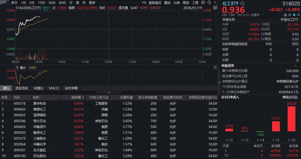 化工板块场内热门布局工具化工ETF(516020)近期亦持续吸金。交易所数据显示,截至上个交易日(1月16日),化工ETF(516020)近5个交易日中有4个交易日获资金净申购,合计净申购额超过4.2亿元;近10个交易日,化工ETF(516020)有9个交易日获资金净申购,合计净申购额更是超过10亿元。