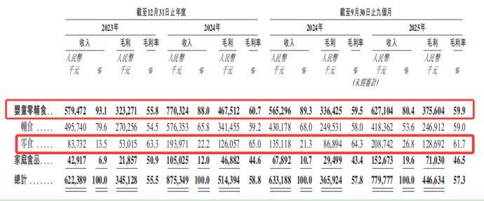 产品结构上,婴童零辅食仍为核心支柱。报告期内,该板块占收入比分别为93.1%、88%、80.4%。平均售价从2023年24.4元/份、23元/份、21.8元/份。主要原因为低价零食类占比分别为13.5%、22.2%、26.8%,拉低了整体盈利水平。而家庭食品板块收入占比虽提升,但毛利率低,难形成有效利润支撑。