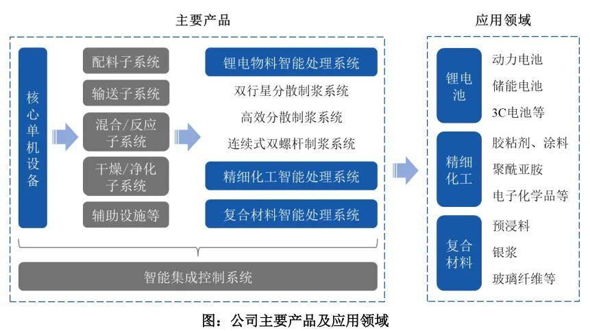 凭借对应用行业特点、物料特性及客户需求的深刻理解,理奇智能已形成覆盖锂电物料、精细化工、复合材料等领域的成熟智能处理系统解决方案。在锂电制造领域,其产品聚焦正负极粉体/液体配料、浆料制备等前段核心工序;面向精细化工行业,可满足胶粘剂、电子化学品等定制化生产需求;在复合材料领域,则服务于预浸料、银浆等材料的精密加工流程。