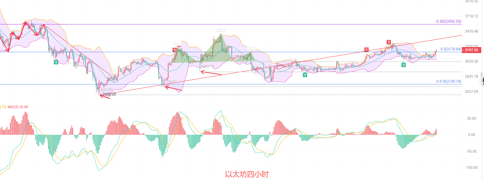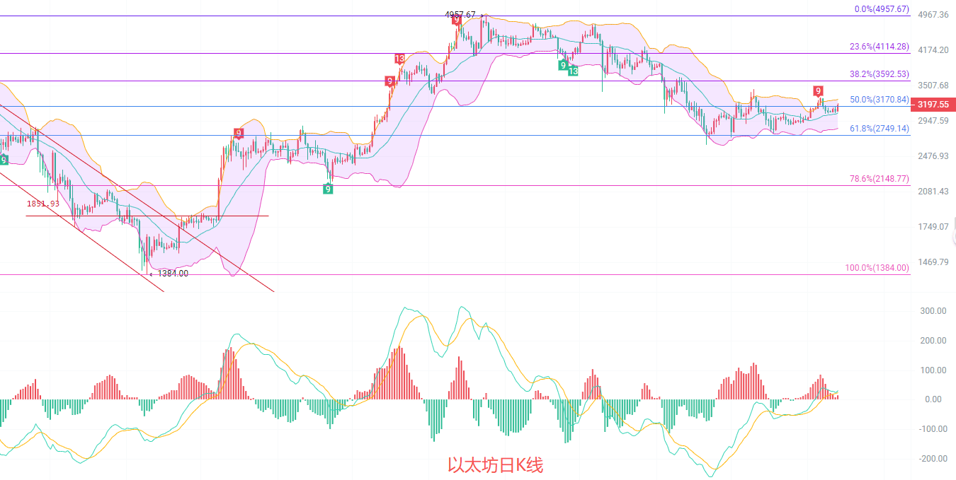 日K线发稿前最高3215,最低3090,EMA趋势指标依旧维持收缩阶段,也就是说行情会在3200关口来回煮青蛙,上冲动能有效,下也有很大概率再次冲击3000,MACD放量增筹,DIF和DEA短息内算是站上了0轴线,布林带中规支撑3065有效,上轨关注3285,思路上北上有效可以持有,南下还需要等这一波动能枯竭以后再考虑
