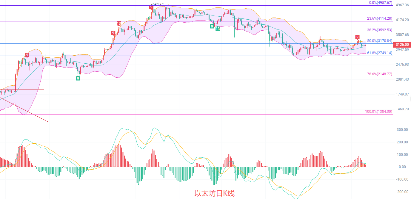 以太坊现价3130,现在是北京时间凌晨三点四十,以太坊日K线发稿前最高3147,最低3083,EMA趋势指标整体处于收缩阶段,也就是说底部支撑有效可以北上,短线阻力位在EMA60一线也就是3160到3170的分割线阻力点,MACD连续放量减少,DIF和DEA迟迟没有拉伸,说明盘口的量能不足,南北趋于平衡,布林带中规3050支撑有效,上轨关注3268,