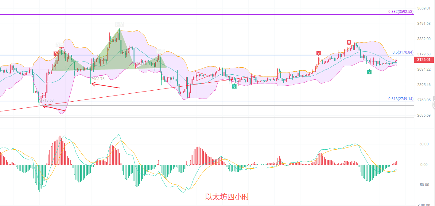 四小时K线关注短线支撑3100,MACD连续放量增筹,多头在3100附近站稳脚跟以后有很大概率拉伸继续北上,DIF和DEA形成金叉,布林带收缩以后上轨3124失守,K线三连阳形成的多头趋势比较强势,短线趋势的盘口走北,暂时谨慎南下,没有上车的币友可以等等看有没有北上的机会