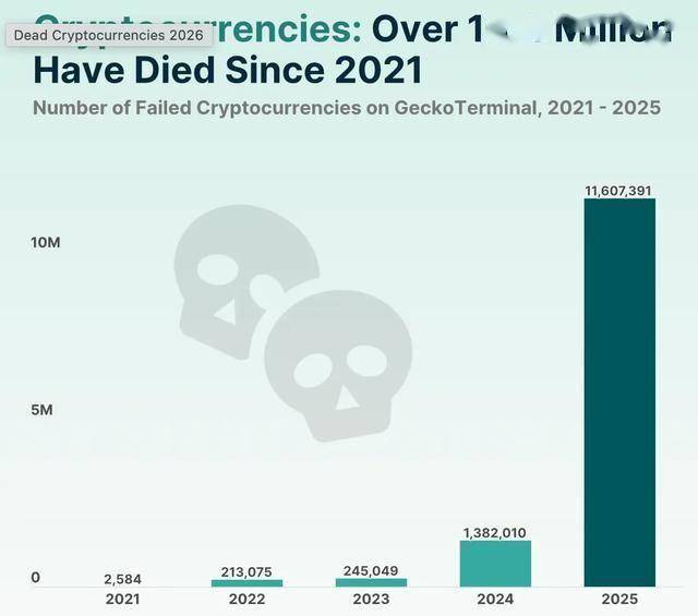 这些“死亡代币”中,高达约1160万个是在2025年内归零或陷入沉寂,占过去五年全部代币失败案例的86.3%。