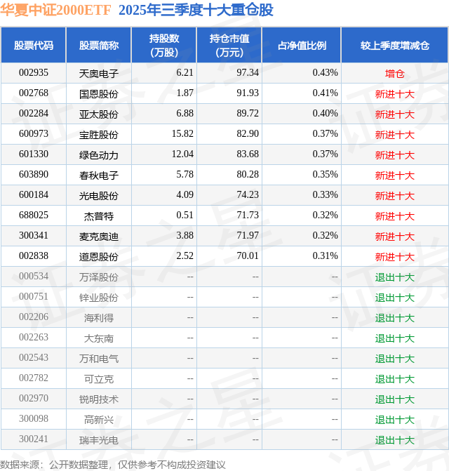 根据2025基金Q3季报公募基金重仓股数据,重仓该股的公募基金共1家,其中持有数量最多的公募基金为华夏基金的华夏中证2000ETF。华夏中证2000ETF目前规模为2.27亿元,最新净值1.8285(1月14日),较上一交易日上涨0.64%,近一年上涨64.73%。该公募基金现任基金经理为鲁亚运 陈国峰。鲁亚运在任的基金产品包括:华夏创业板成长ETF联接A,管理时间为2022年6月10日至今,期间收益率为2.06%;华夏中证全指证券公司ETF联接A,管理时间为2022年6月10日至今,期间收益率为33.81%;华夏国证疫苗与生物科技指数发起A,管理时间为2022年9月6日至今,期间收益率为-28.85%;华夏战略新兴成指ETF联接A,管理时间为2023年3月27日至今,期间收益率为35.67%。陈国峰在任的基金产品包括:华夏中证800指数增强A,管理时间为2023年3月30日至今,期间收益率为23.82%;华夏中证A500增强策略ETF,管理时间为2025年8月6日至今,期间收益率为16.6%;华夏中证2000ETF发起式联接A,管理时间为2025年9月9日至今,期间收益率为11.95%。