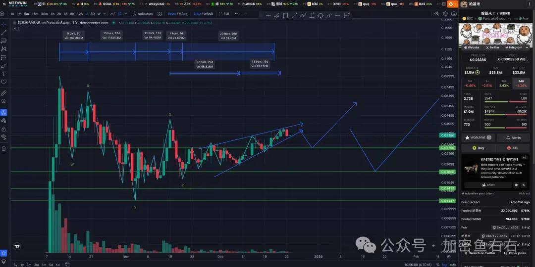 哈基米依然在慢慢推土机模式往上推,稳如老狗,在BSC行情极度枯竭的同时,又被 Sol/Base/Coinbase 前后围攻背景之下—批准上币安现货,目前哈基米楔形完成,马上选择方向,短择。
