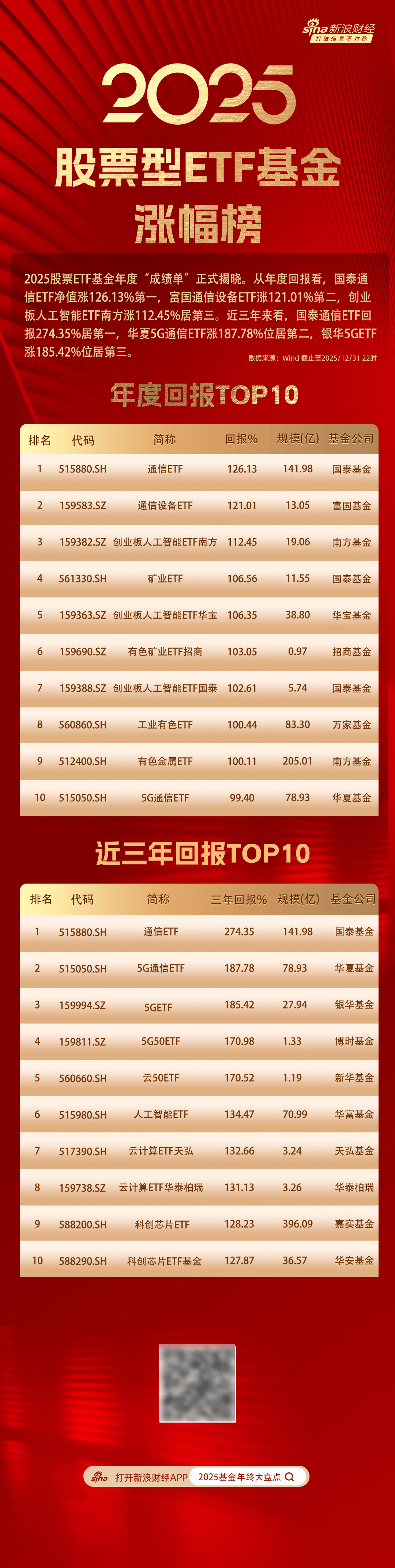 12月31日,2025股票ETF基金年度“成绩单”正式揭晓。从2025年度回报看,国泰基金通信ETF以区间净值涨幅126.13%位居第一,富国基金通信设备ETF区间回报121.01%位居第二,创业板人工智能ETF南方区间回报112.45%位居第三。
