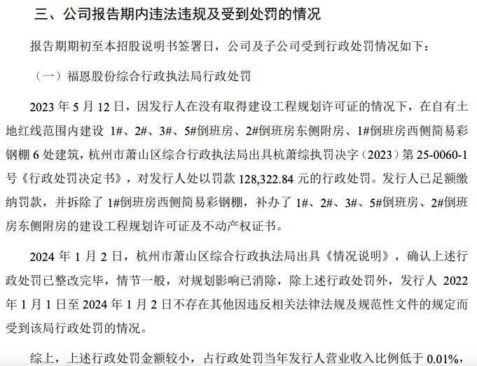 2023年5月,福恩股份因在没有取得建设工程规划许可证的情况下,在自有土地红线范围内建设1#、2#、3#、5#倒班房、2#倒班房东侧附房、1#倒班房西侧简易彩钢棚6处建筑,被杭州市萧山区综合行政执法局处以12.83万元的行政处罚罚款。