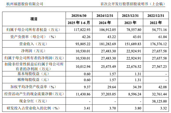 据招股书(上会稿),福恩股份2025年度的盈利预测为:营业收入17.1亿元,同比下降-5.79%;归属于母公司股东的净利润2.29亿元,同比下降16.61%;扣非归母净利润2.12亿元,同比下降16.86%。