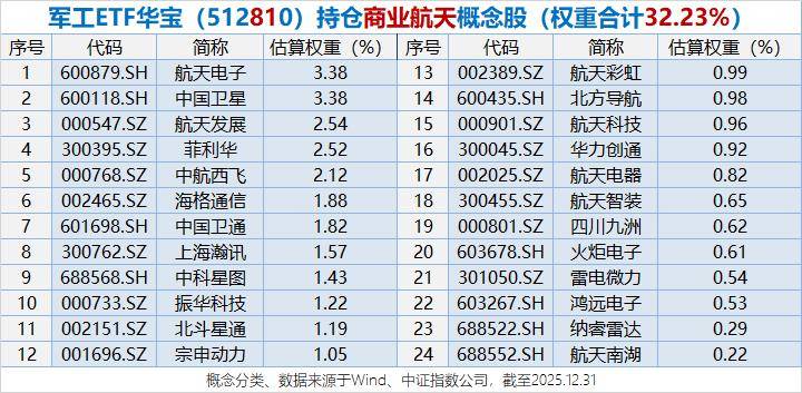 投资商业航天,配置工具关注军工ETF华宝(512810),其标的指数中证军工覆盖24只商业航天概念股,权重合计超32%。此外还覆盖 可控核聚变 、低空经济、大飞机、深海科技、军用AI等诸多热门主题。