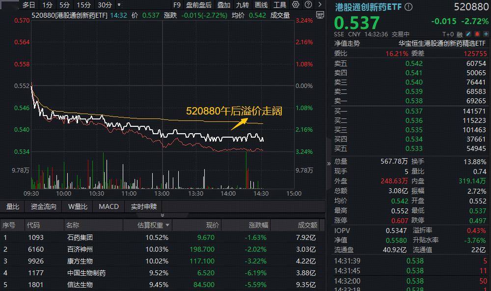 1月19日午后,港股通创新药延续弱势,创新药含量100%的港股通创新药ETF(520880跌逾2.7%,场内宽幅溢价,显示买盘态度积极,当前板块或再度行至配置窗口期。