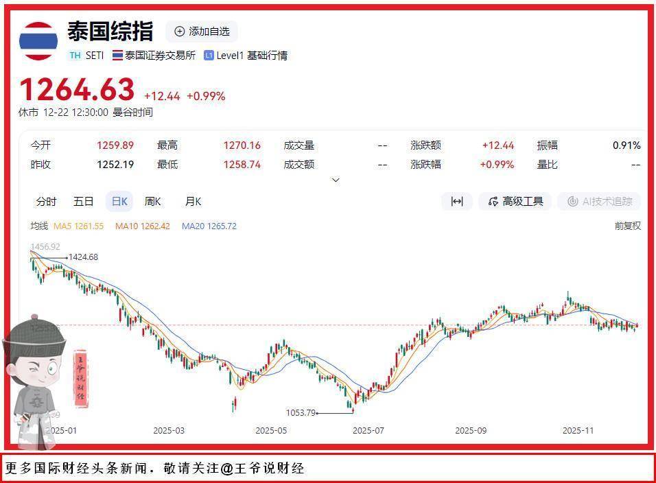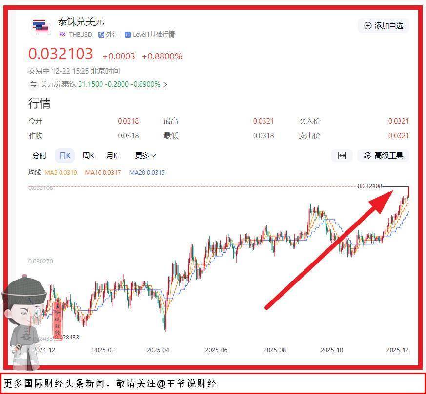 2025年12月22日,东南亚金融市场传来重磅消息:泰铢兑美元汇率跌至31.3080,创下自2021年6月以来的4年半新高,当天泰国SET指数也同步上涨1%,收于1264.63点。
